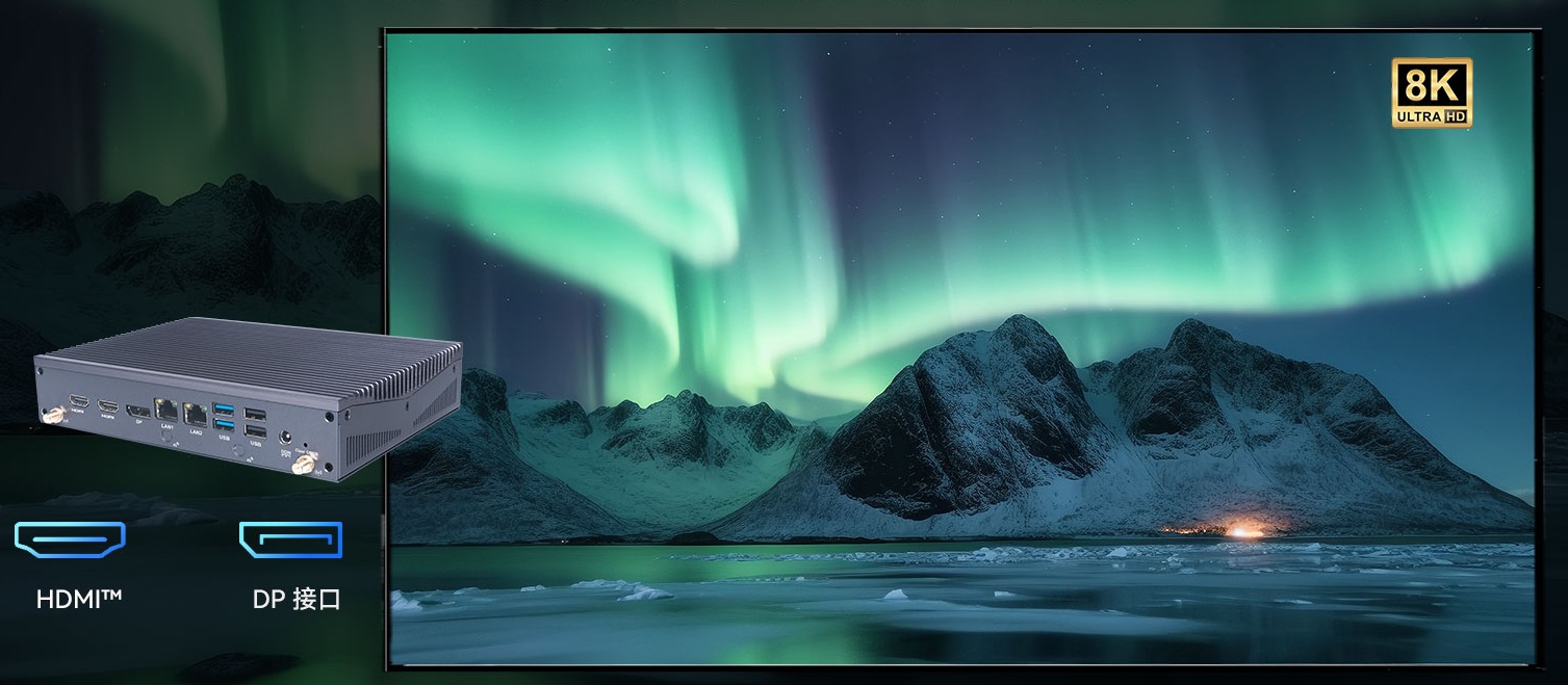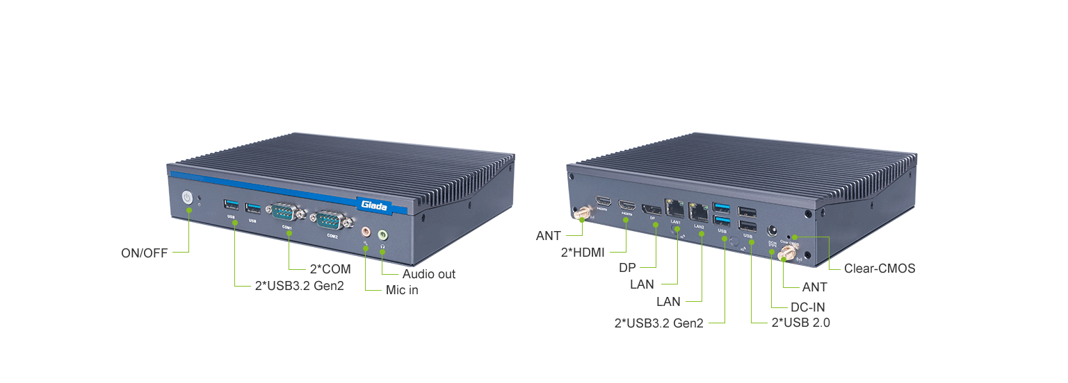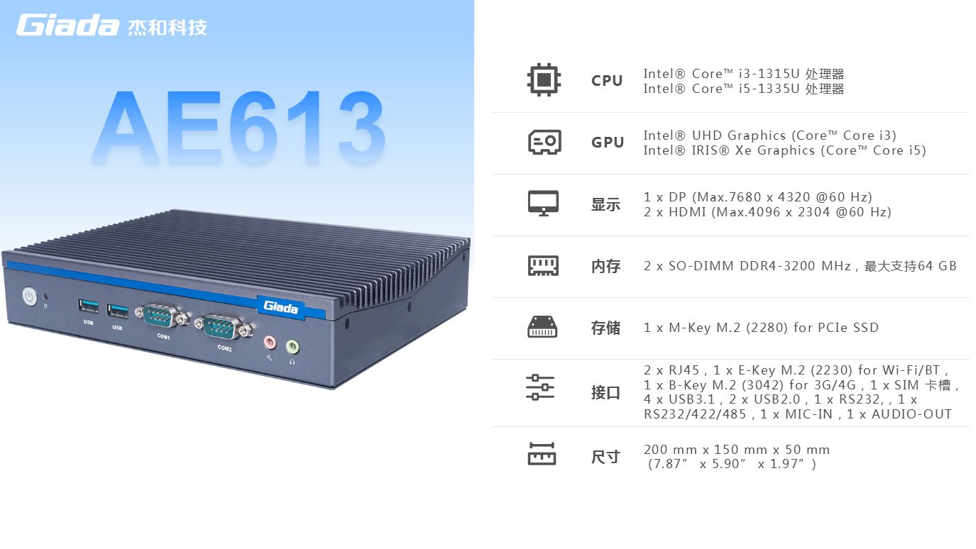 博天堂精品(中国)官方科技AE613支持Windows 11 (64bit) /Linux Ubuntu (64bit)系统,双千兆自适应RJ45网口,4 x USB3.1 (10 Gbps),2 x USB2.0,1 x RS232,,1 x RS232/422/485,1 x MIC-IN,1 x AUDIO-OUT,丰富的I/O功能接口,实现更多功能扩展。