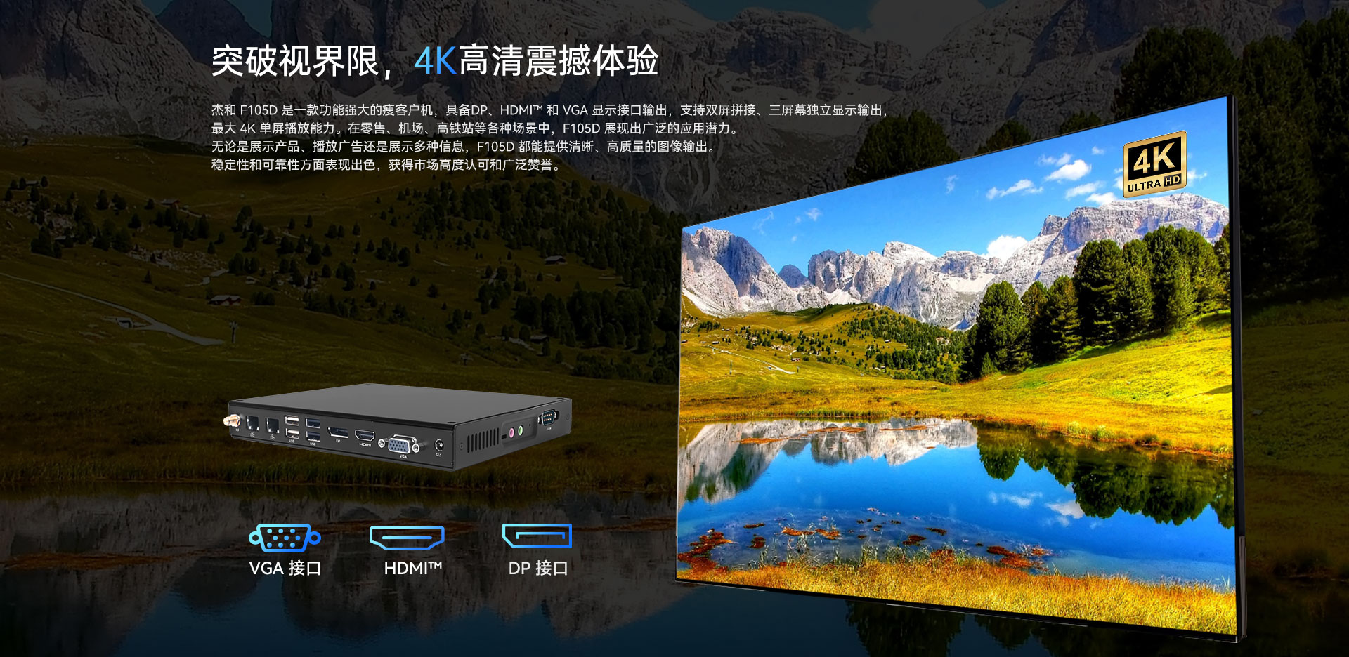 支持1x DP+1x HDMI+1x VGA显示接口输出