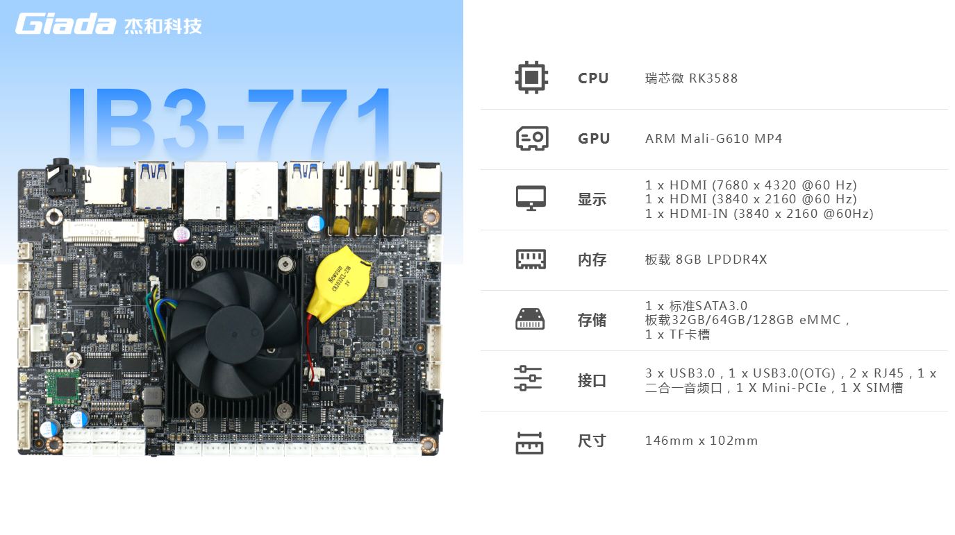 博天堂精品(中国)官方主板IB3-771内置瑞芯微新一代旗舰级高端芯片RK3588,6TOPS算力的NPU,具有高算力、内存大、超强多媒体、多重扩展等技术优势。支持主流深度学习框架,能够为各类养老 AIOT 应用场景提供更优的性能表现。